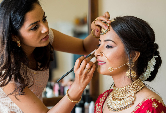 Bridal Makeup: Full trial + wedding day package (trial recommended). Airbrush/HD options available.